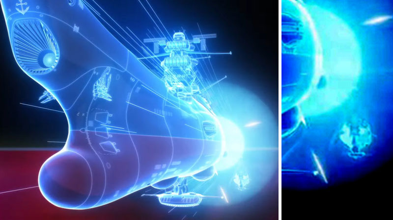 本予告、0.52秒の部分で流れるヤマトのこのワープシーン、動画では分り辛いですがこのカットを切り抜き、色調補正をかけてみると、ヤマトの背後にもう1隻のヤマト型らしい艦が確認できます。