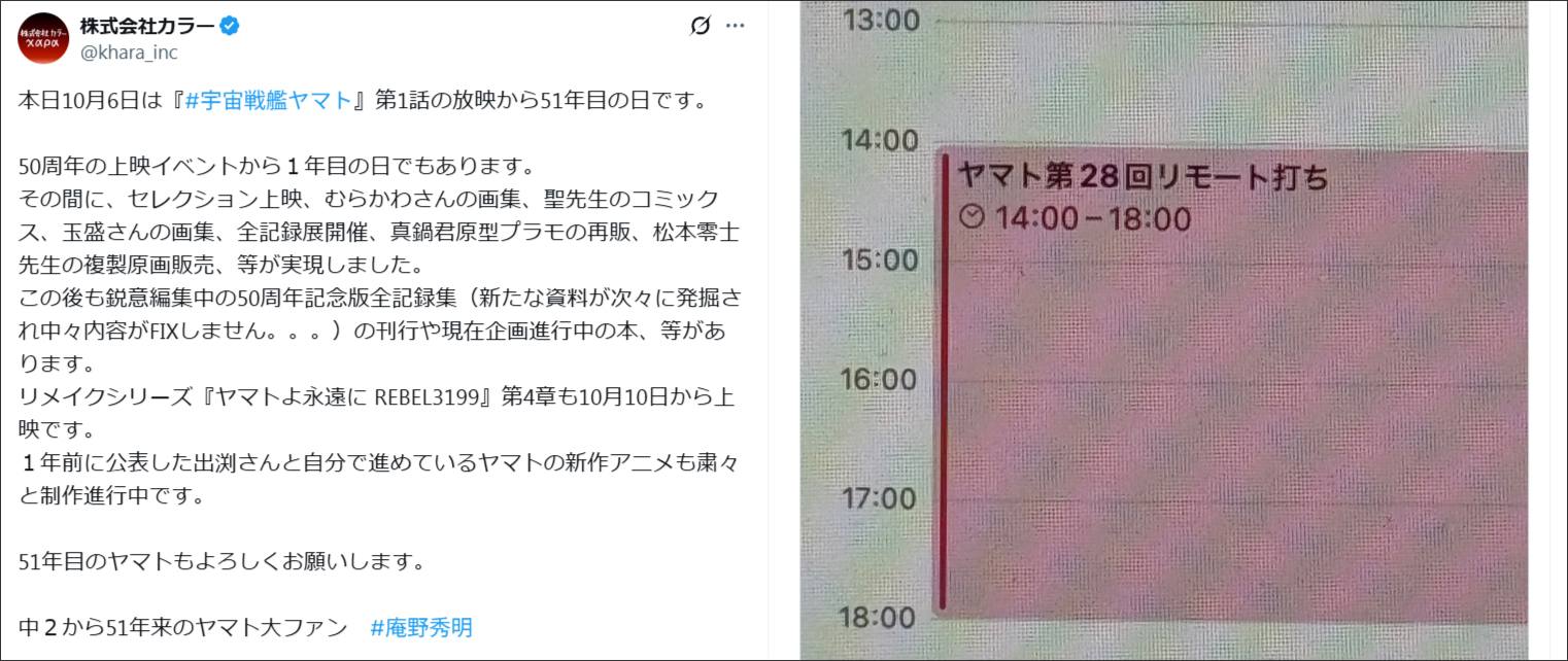 ちょうど50周年目にあたる昨年には「宇宙戦艦ヤマト放送50周年記念上映会」が開催され、庵野監督による新作劇場版の制作が発表されましたが、もうあのイベントから1年経過したのかと思うと改めて時間の流れる早さに驚かされますね。